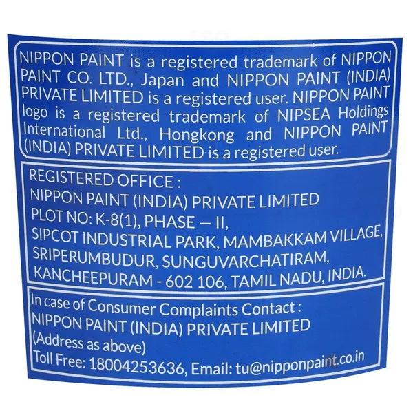 | Packed By | Nippon Paint (India) Private Limited. Plot No. K-8(I), Phase-II, Sipcot Industrial Park, Mambakkam Village, Sriperumbudur, Sunguvarchatiram, Kancheepuram, Tamil Nadu - 602106. |